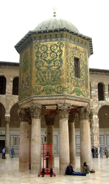 Beribu tahun dahulu merupakan sebuah kuil untuk tuhan Hadad bagi kaum Aramic. Semasa zaman Rom ia menjadi kuil Jupiter dan menjadi gereja pada abad ke 4, dibesarkan menjadi Cathedral of St. John dan pada 661M islam telah menawan kota Damascus oleh Muawiyah b Abu Sufyan di mana muslim telah berkongsidgn kristian.Islam solat sebelah timur dan kristian sebelah barat sehingga Walid b Malek berkuasa yang mana merasakan satu keperluan bagi muslim menyatakan pendirian hak pada agama.lalu beliau telah bernegosasi dgn ketua2 Kristian .Pihak islam akan mengambil alih kesemua binaan tersebut utk menjadisebuah masjid dan khalfah berjanji; Gereja-gereja lain tidak akan di sentuhsamada dgn gereja2 baru yg akan dibina.